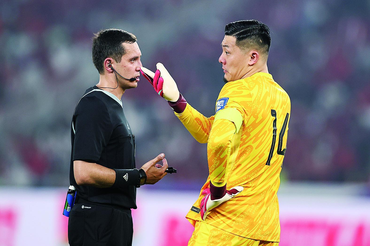 6月5日,中国队守门员王大雷(右)在比赛中与裁判交流。 新华社发